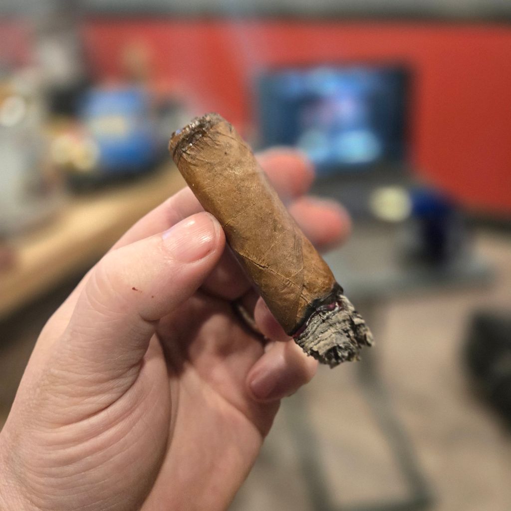 The burn remains even with a thick burn line throughout the smoke. The flavors evolve in the back third to include sourdough bread, butter, leather, and a lot of smoke, creating a great room note. The profile deepens with spice, leather, earth, and darker cedar notes. The ash turns darker gray, and the retrohale features pepper, citrus (possibly orange), and cedar spice. The body is medium to medium-plus, and the strength is medium. The cigar becomes creamier towards the end.