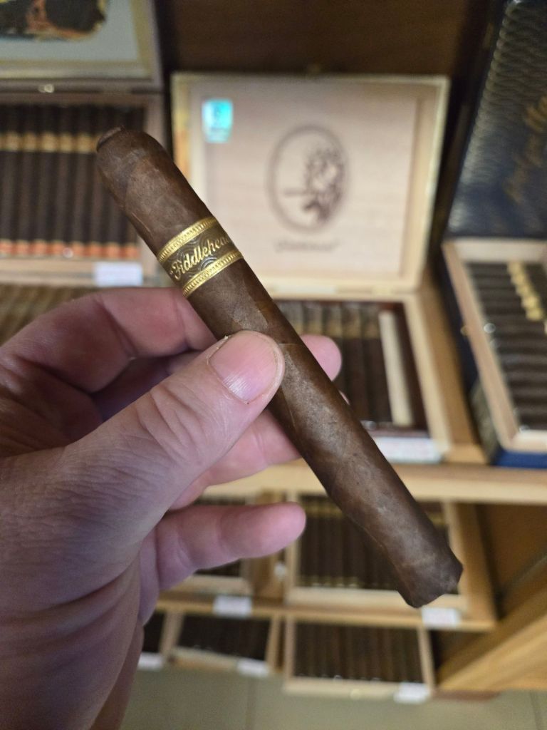 The CANH Fiddlehead boasts a medium brown Sumatra wrapper that is velvety smooth with a significant oily sheen. The draw is firm but acceptable, and the cold draw brings notes of barnyard, leather, and caramel.